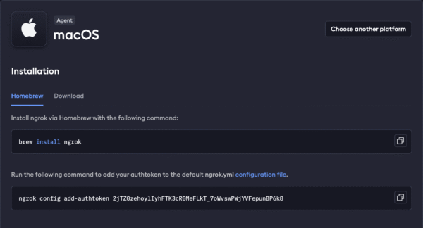 1. เปิด Browser แล้วเข้าไปที่: https://dashboard.ngrok.com/get-started/setup เลือกดาวน์โหลด ngrok ตามระบบปฏิบัติการของคุณ แล้วติดตั้งตามขั้นตอนจามรูปข้างล่าง