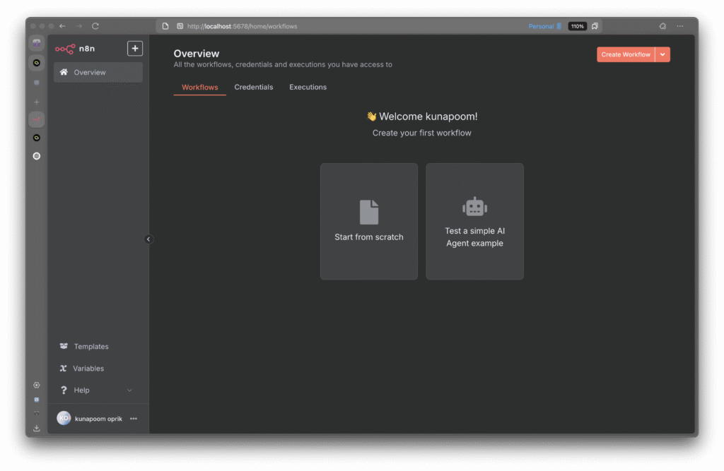 คุณสามารถเริ่มสร้าง Workflow ได้ทันทีผ่านหน้า Web UI ของ n8n — ผ่าน Public URL ของ Ngrok หรือ localhost
