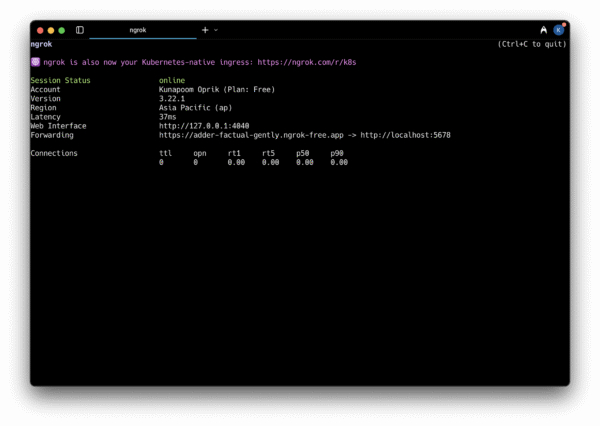 เท่านี้คุณก็สามารถนำลิงก์นี้ไปใช้งานหรือแชร์ให้ผู้อื่นทดสอบได้ โดยลิงก์ public URL จะอยู่ตรงบรรทัดที่ขึ้นต้นด้วยคำว่า Forwarding ในหน้าต่าง ngrok
